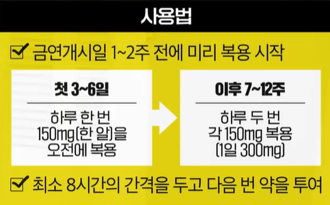 - 사용법 : 금연 개시일 1주전부터 복용.