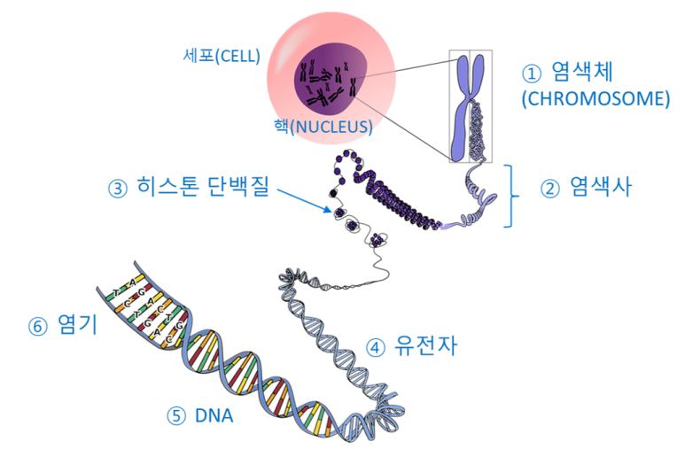 자, 일단 책의 내용을 정리하기에 앞서, 기본적인 세포, 핵, 염색체, 유전자의 관계를 한 번 이해하고 들어가는 것이 좋겠다.